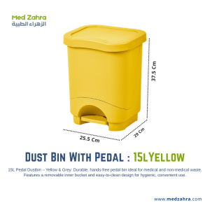 15L pedal-operated dust bin in yellow and grey, ideal for hygienic waste disposal in homes, offices, and medical spaces. Durable, hands-free, and easy to use.