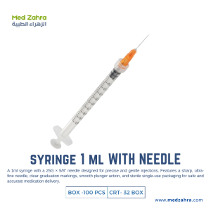 The 1ml Disposable Syringe is a high-quality, sterile, single-use syringe designed for precise and safe administration of medications. Equipped with a 25G × 5/8" needle, it ensures minimal discomfort during injection. Each box contains 100 syringes, and a carton includes 32 boxes, making it ideal for clinics, hospitals, and healthcare facilities requiring reliable, ready-to-use syringes.