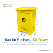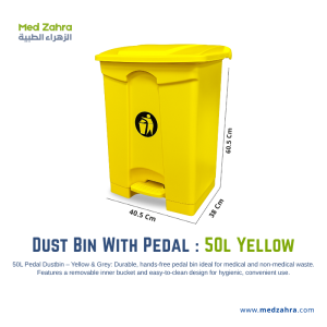 Durable 50L dust bin with foot pedal, ideal for medical and non-medical use. Yellow and grey design ensures hygienic, hands-free waste disposal.