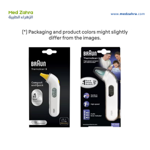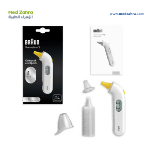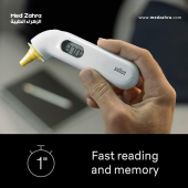 Measures body temperature in the ear using infrared heat from the eardrum.